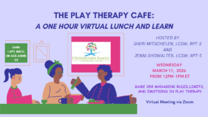 March TOPIC: Game On! Managing Rules, Limits, and Emotions in Play Therapy Children love to play games—whether it’s a board game, an imaginative role-play they create, or a physical competition. Games often bring out strong emotions and relational patterns, making them a powerful therapeutic tool. This lunch-and-learn explores how to therapeutically manage games in play therapy sessions, including navigating challenges such as cheating, changing rules, winning and losing, frustration, and power struggles. Participants will discuss how to set developmentally appropriate limits, maintain the therapeutic relationship, and use game play to support emotional regulation, self-control, and relational growth while staying aligned with child-centered principles.